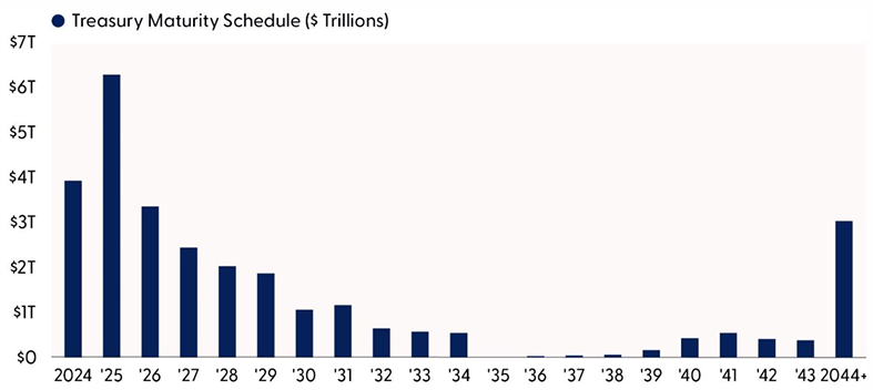 While economic growth will remain the driver of interest rates, a secondary risk to rates remains the amount of Treasury debt needed to fill federal budget deficits that are expected to stay elevated. Per the Congressional Budget Office (CBO), the U.S. government is expected to run sizable deficits over the next decade — to the tune of 5–7% of gross domestic product (GDP) each year. The deficit increases significantly in relation to GDP over the next 30 years, reaching 8.5% of GDP in 2054. That growth results from rising interest costs and large and sustained primary deficits. CBO deficit projections assume no new spending initiatives nor an extension of the Tax Cuts and Jobs Act, which is set to sunset at the end of 2025, so the CBO forecast likely underestimates budget deficits going forward. And to fill those deficits, the Treasury Department will need to issue trillions more in Treasury securities. But complicating the math for the Treasury Department, it will also need to roll over more than $6 trillion in Treasury securities set to mature in 2025. Thus, the Treasury will need to find investors for some $8 trillion of Treasury debt over the next 12 months.