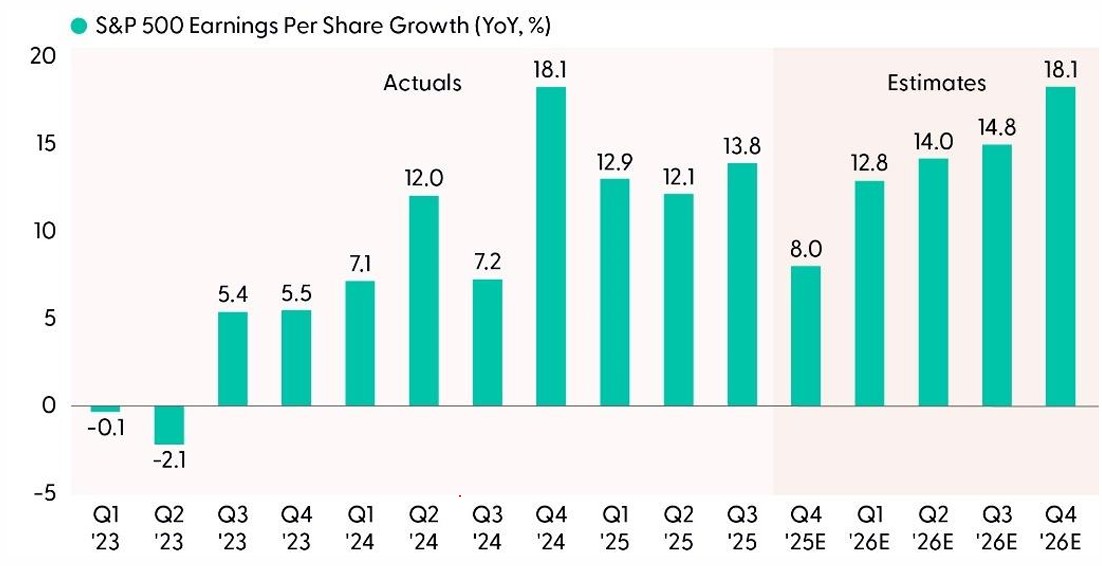Fourth quarter earnings season unofficially kicks off this week with a dozen banks and asset managers in the S&P 500 slated to report. Results will come from some big names, including JPMorgan Chase (JPM) on Tuesday; Bank of America (BAC), Wells Fargo (WFC) and Citigroup (C) on Wednesday; and Blackrock (BLK), Goldman Sachs (GS), and Morgan Stanley (MS) on Thursday. After these and the rest of the results are in, we believe there could be a continuation of an impressive streak of quarters with double-digit earnings growth, expanding profit margins despite tariffs, and another quarter of strong earnings growth from the technology sector and the AI buildout.