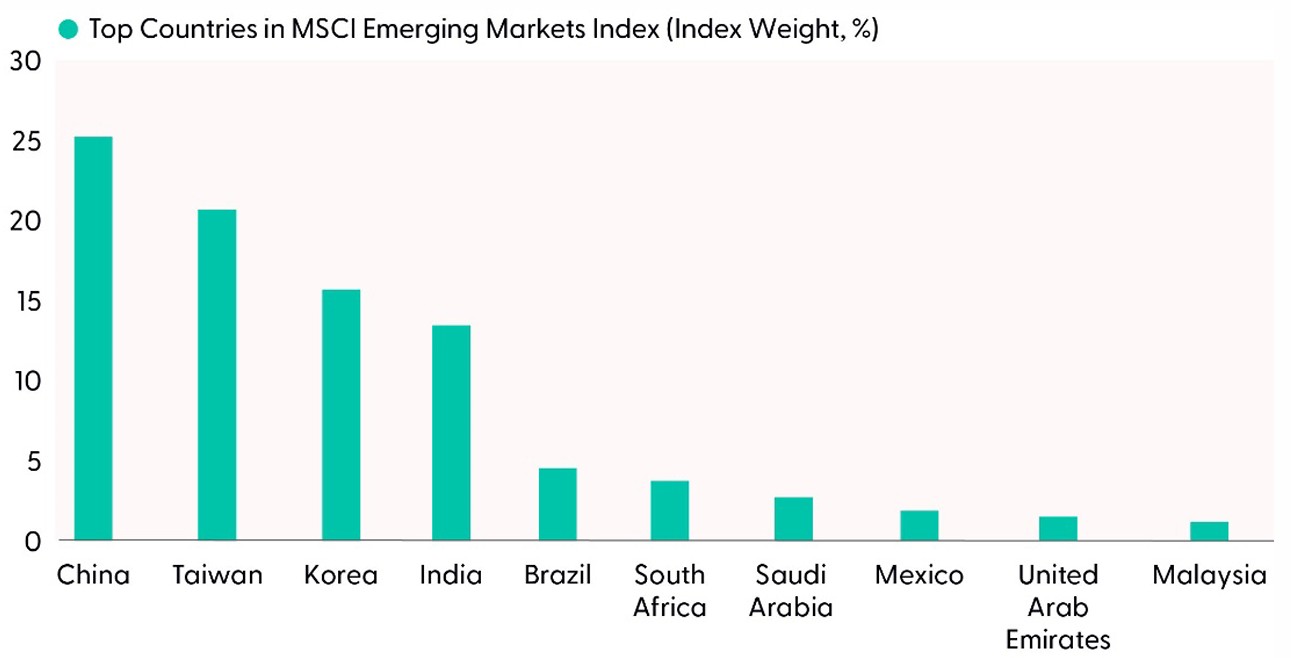 As the accompanying chart illustrates, much of the heavy technology weighting in the EM index comes from Asia, where the top country weightings are China, Taiwan, Korea, and India. In fact, the biggest non-Asia country weighting in the EM index is Brazil at 4.6%.