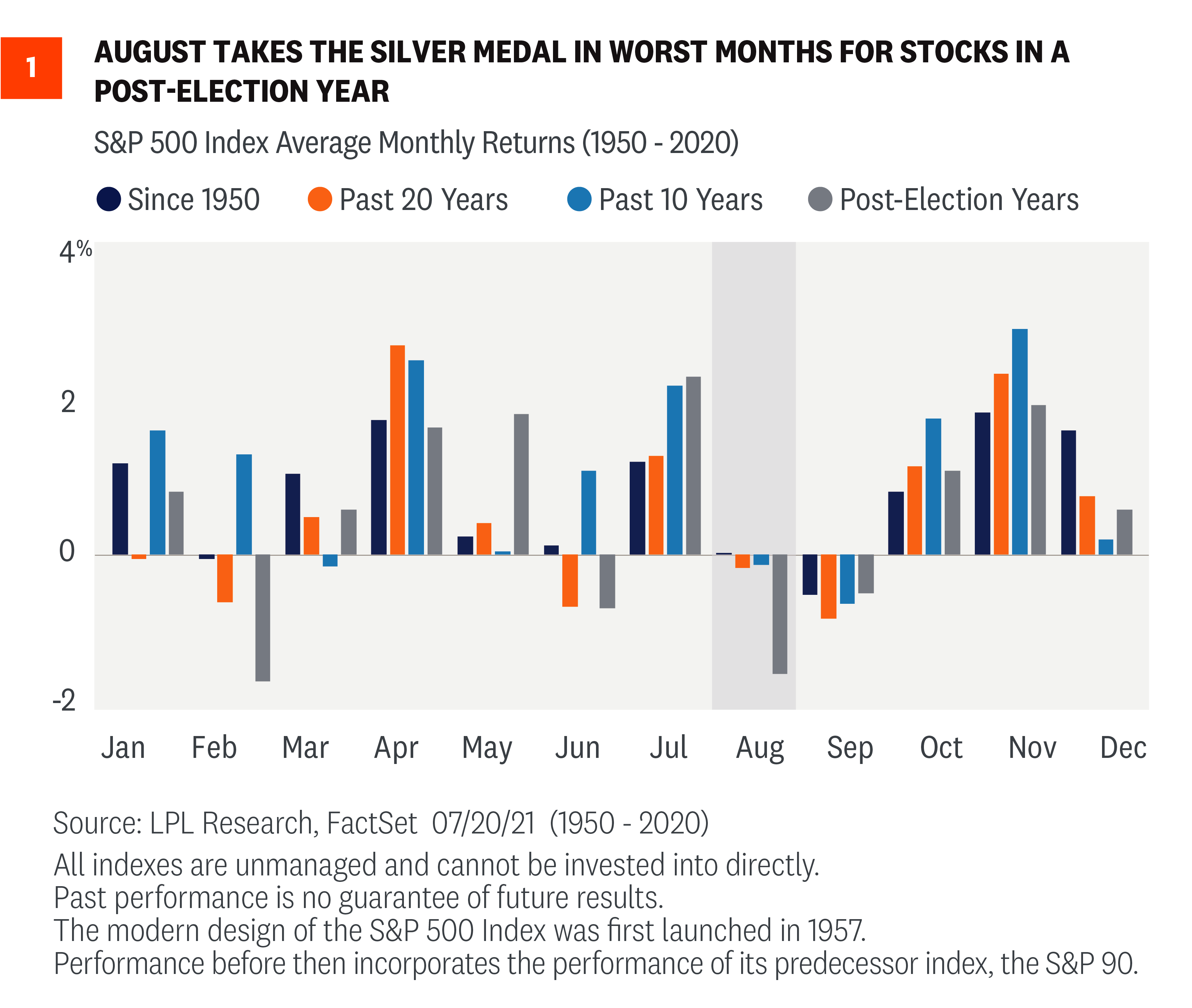 At the start of the month we noted that July is the best month of the year for stocks in a post-election year; well, the bad news is August is quite weak in a post-election year. As Figure 1 shows, the S&P 500 Index is down 1.4% on average in post-election years, with only February worse. Taking things a step further, when August is lower, it can be really lower. In fact, since 1950, when August is negative it is down 3.9% on average, making it the worst month of the year when it is lower.