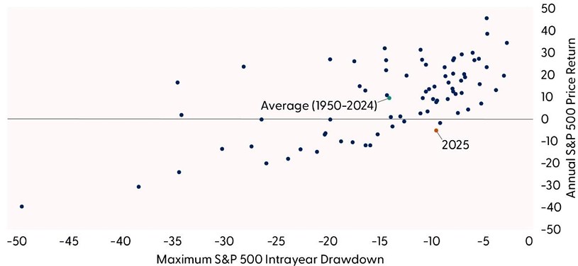 S&P 500 Annual Price Returns vs. Intra-year Drawdowns (1950-YTD)